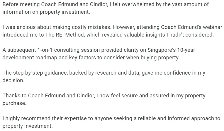 Do note that results may vary on a case-by-case basis as I analyse the suitability of your property and determine if I can assist you further.